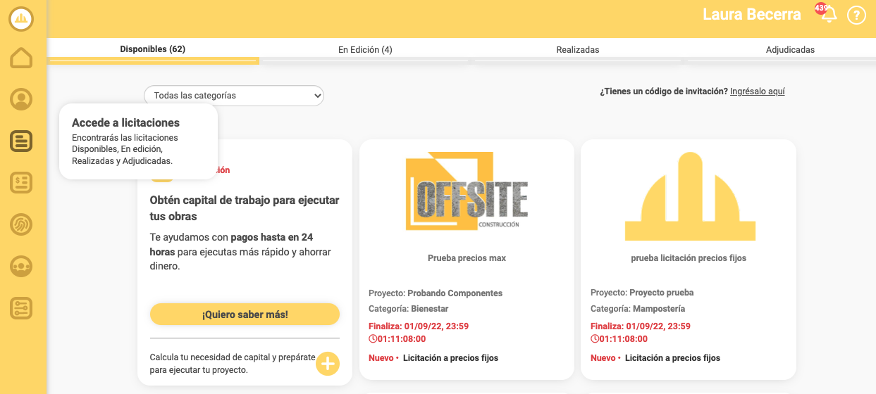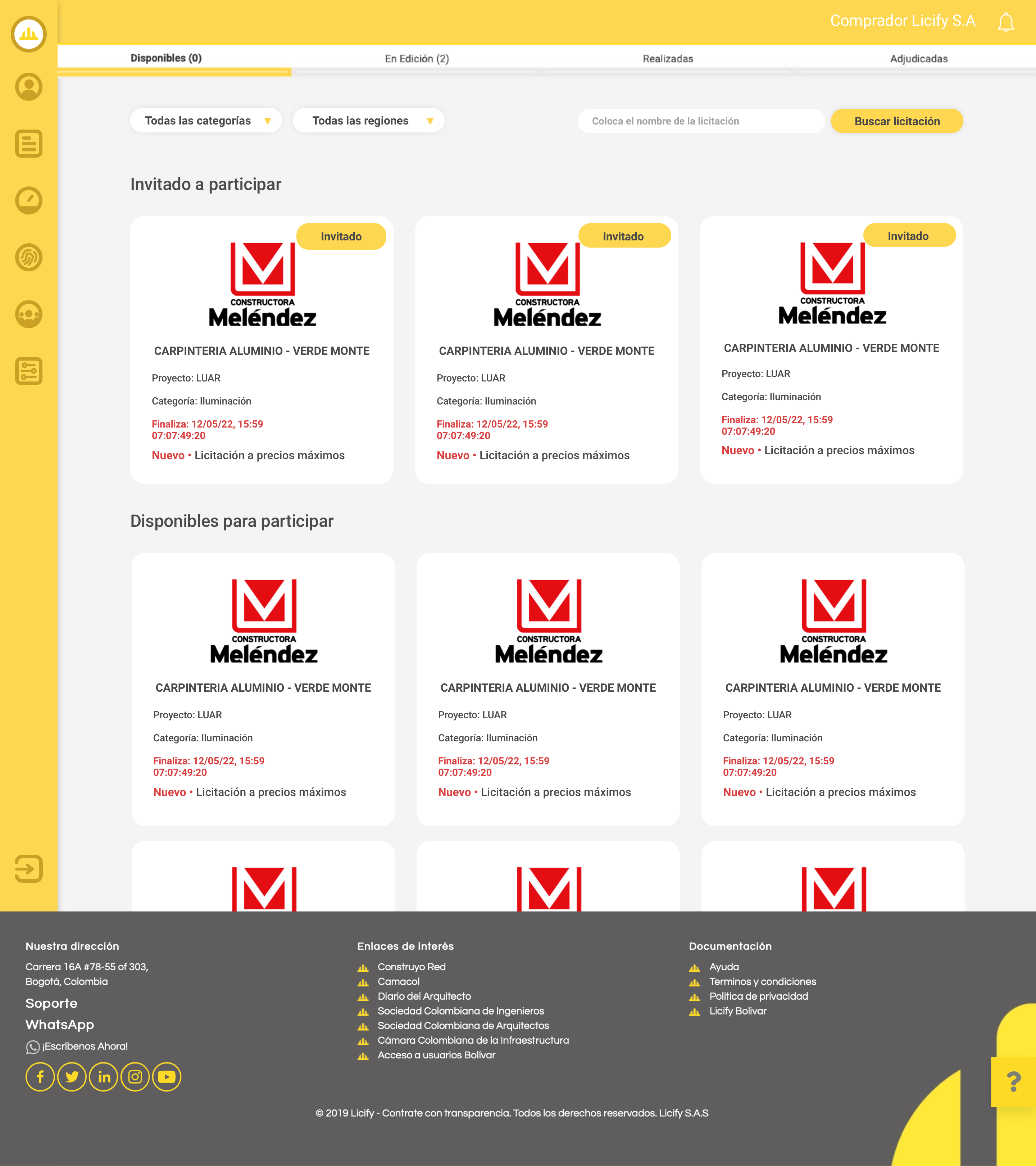 Cuándo las licitaciones son cerradas o la constructora re ha invitado a participar, en el apartado Licitación encontrarás todos los proyectos al cual pueden empezar a cotizar de primeras.