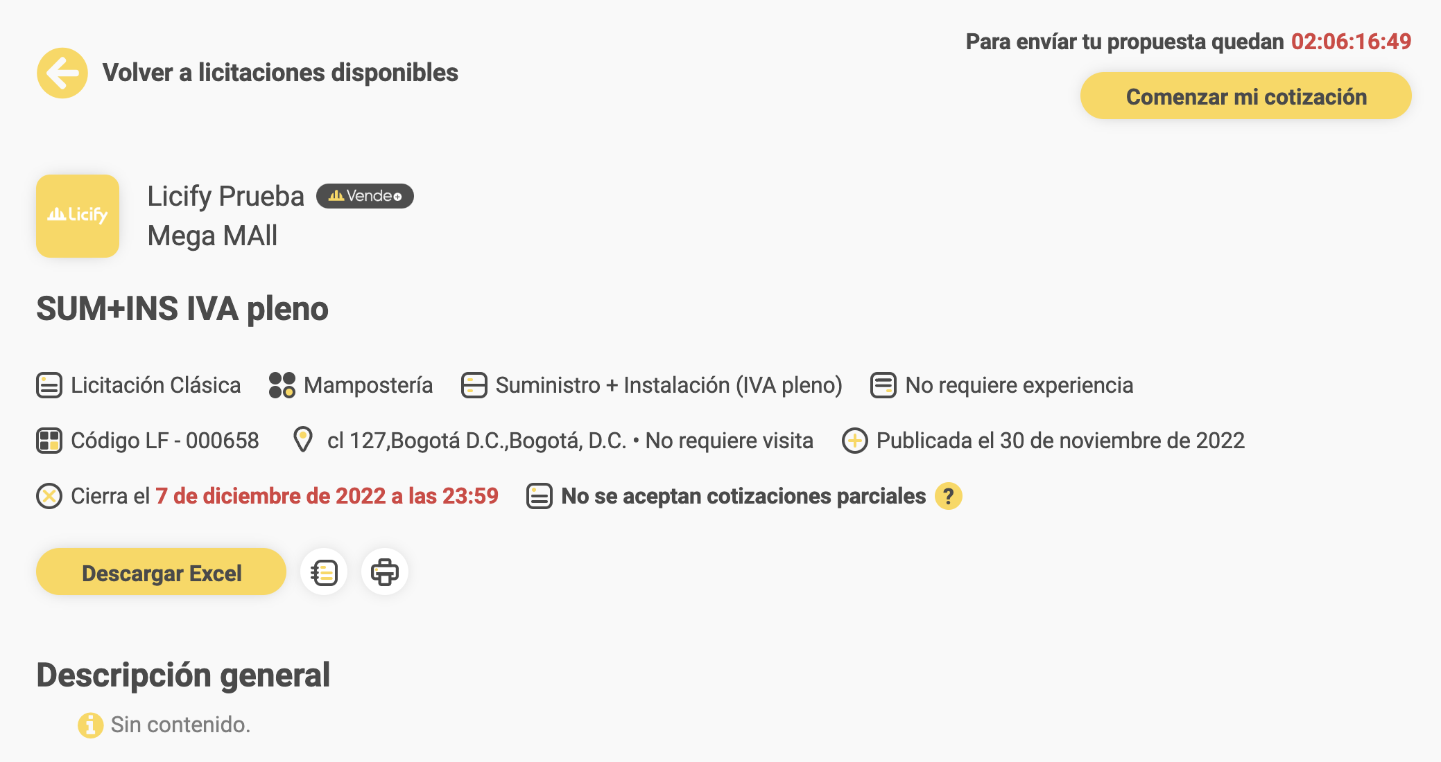 •Descripción general: Podrás visualizar una breve descripción de la licitación y su contenido, así como las condiciones para la presentación de la propuesta comercial.