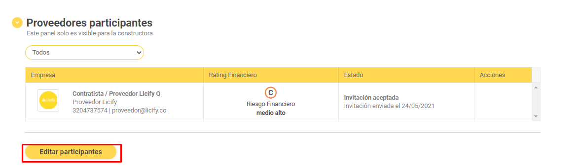 Para EDITAR PARTICIPANTES de una licitación que se encuentre en estado PUBLICADA debes ingresar a la licitación de tu interés y seleccionar la opción EDITAR PARTICIPANTES y adicionar los nuevos proveedores que deseas invitar a participar en tu licitación.