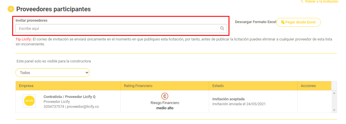 Cuando des clic al botón te llevará al apartado de invitación a proveedores, el mismo que diligenciaste en el paso # 4 de tu licitación clásica. En el buscador de proveedores puedes invitar a los participantes que quieras que te envíen una cotización a tu licitación, esta invitación llegara por correo de forma personalizada con el nombre de la constructora.