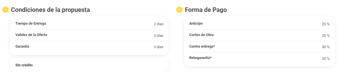 En el segundo paso debes diligenciar las condiciones de la propuesta en cuanto a tiempo de entrega, validez de la oferta, garantía y observaciones. Así mismo debes indicar los porcentajes de la forma de pago propuesta en temas de anticipo, cortes de obra, contra entrega y retegarantía. Finalmente, deberás indicar si puedes otorgar crédito al cliente y su plazo.