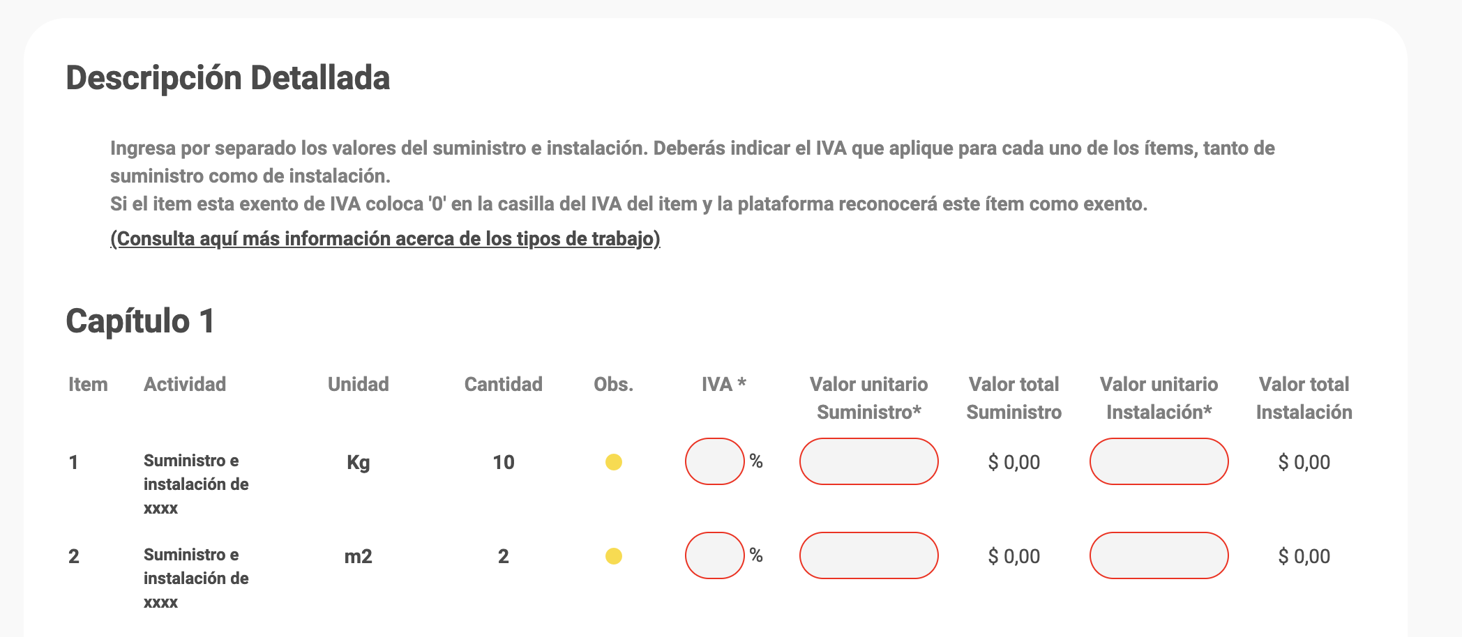 En este paso encontrarás los ítems a cotizar a la constructora, la forma de colocar es por medio de diligenciar la propuesta según los puntos que nosotros te indicamos, ten en cuenta lo siguiente.