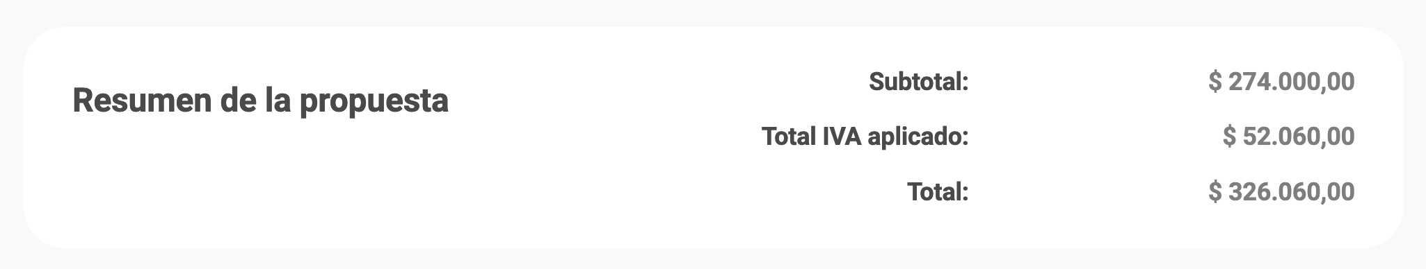 El resumen de la propuesta discrimina según el tipo de cotización, los porcentajes se verán discriminados y podrás confirmar el monto sumando en cada una de las partes de forma independiente.
